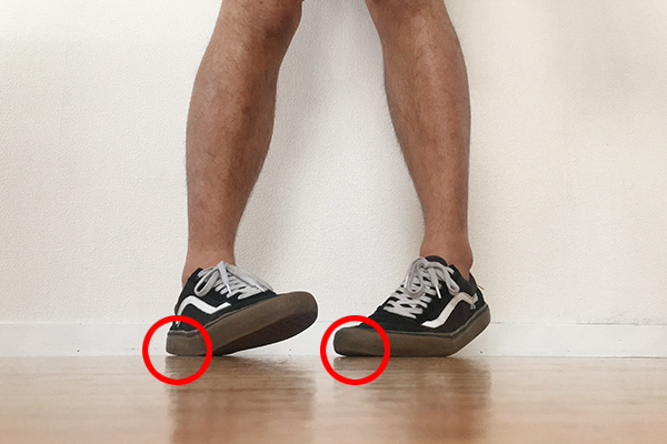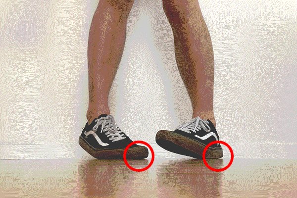 ③元の状態(内股)に戻し、左足のかかと、右足のつま先に切り替える。