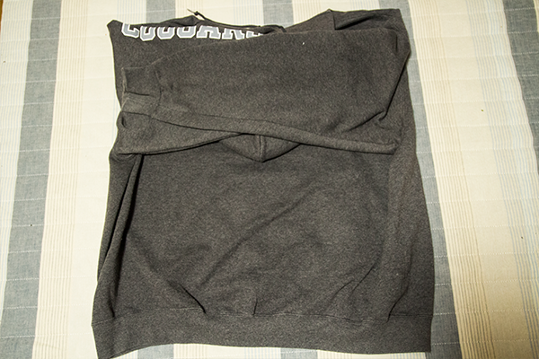 ①フードは先程と同様、内側へ折り返しておき、腕部分は縦に折り返します。