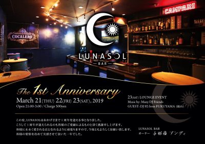 BAR LUNAの閉店後、2018年3月23日にオープンした「BAR LUNASOL」。音楽を楽しみつつ、お酒やダーツなどを楽しめるバーです。カラオケもあり、各種貸切パーティーの予約も可能!飲み放題、フードコースもあるのでぜひ問い合わせてみましょう。