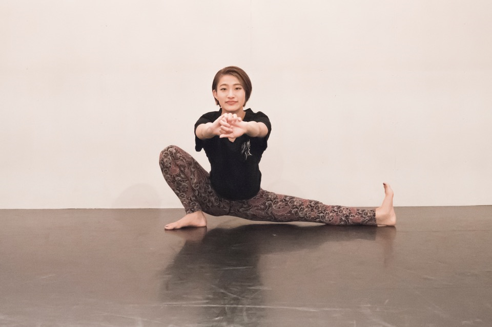 脚を肩幅より広めに開き、伸脚します。しっかりとお尻を落としたら、つま先を上に向けてハムストリングスの伸びを感じましょう。