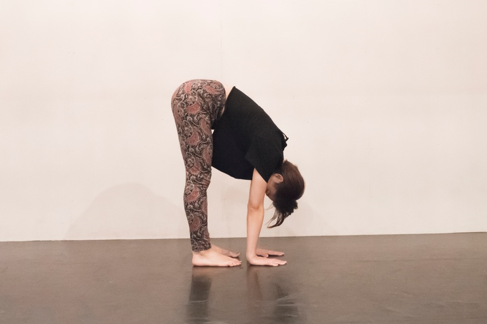 立った状態で前屈をして、ハムストリングスをストレッチします。このとき、できるだけお尻を天井の方に突き出すイメージで裏側全体を伸ばしましょう。