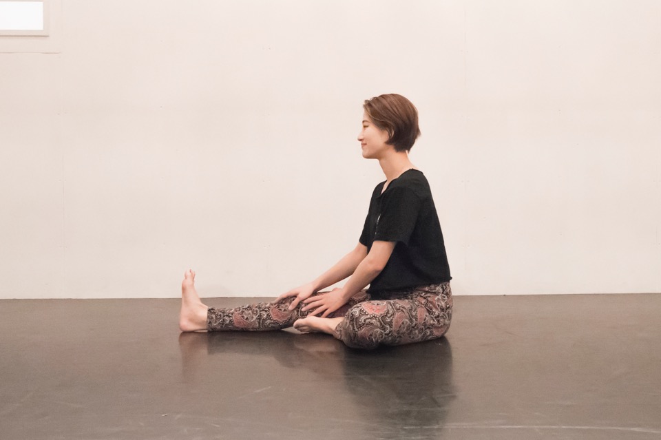 一方の脚を伸ばして、もう一方は膝を曲げて座ります。そのままつま先の方向に骨盤を倒していき、ハムストリングスをストレッチしましょう。このとき、体幹ではなく骨盤を倒すことを意識してください。