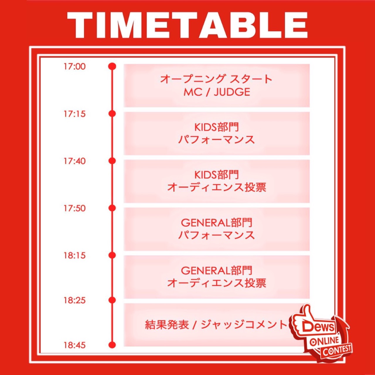 中学生以下のKIDS部門と高校生以上のGENERAL部門に分かれ、予選はエントリー期間中のInstagramでのいいね数により争われる。各部門の上位8名が決勝である「DewsTV」の生配信イベントに出場!実際に生でパフォーマンスをし優勝者が決定!!