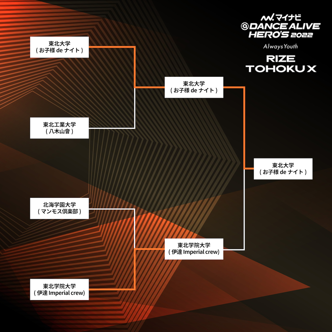 2022年1月10日、国内発信であり世界最大規模のダンスバトルイベント「マイナビDANCE ALIVE HERO’S 2022」大学対抗のクルーバトルRIZE部門の東北予選”RIZE TOHOKU X”がROCK FOOT SENDAIにて行われた。今シーズンの予選は、オフラインとオンラインで開催。勝てば即FINALIST決定。東北での予選を制したのは、東北大学。
