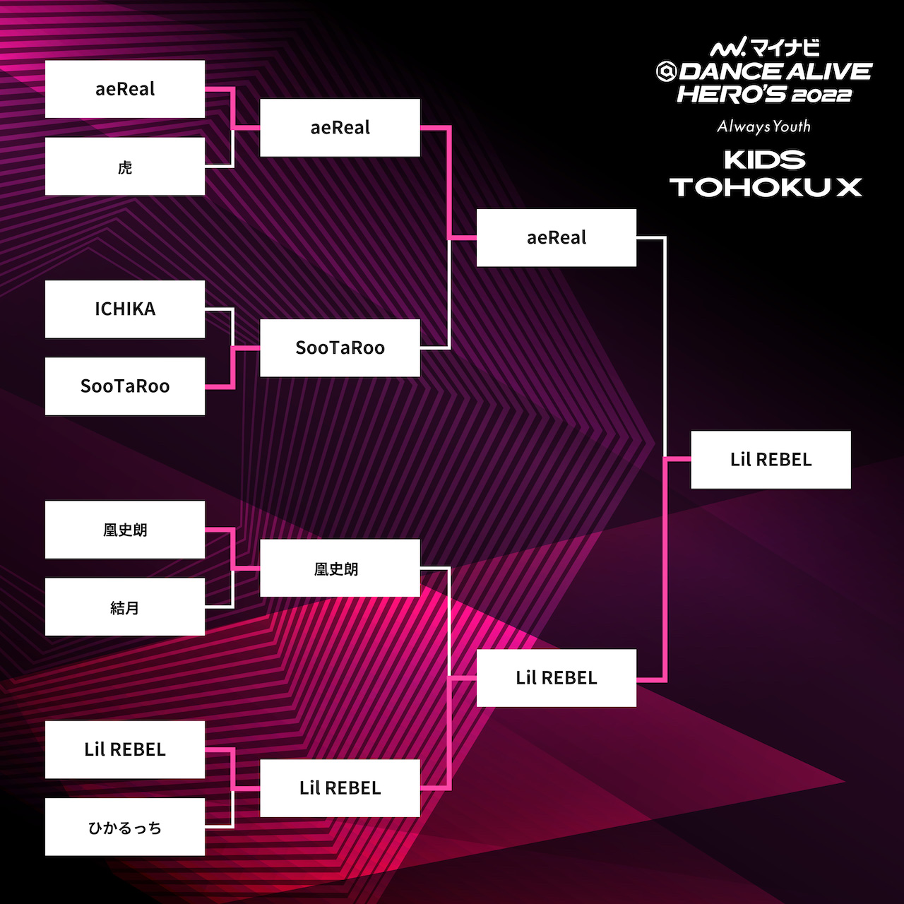 2022年1月10日、国内発信であり世界最大規模のソロダンスバトルイベント「マイナビDANCE ALIVE HERO’S 2022」KIDS部門の東北予選”KIDS TOHOKU X”がROCK FOOT SENDAIにて行われた。今シーズンの予選は、オフラインとオンラインで開催。優勝者と準優勝者が即FINALIST決定となる。東北での予選を制したのは、Lil REBEL。FINAL出場を決めたのは下記2名。