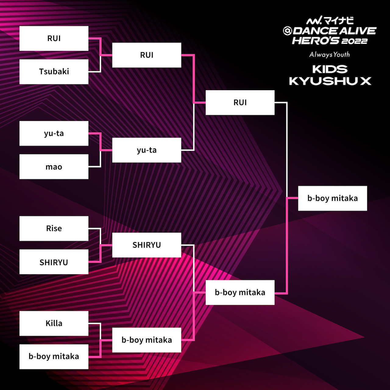 2022年1月30日、国内発信であり世界最大規模のソロダンスバトルイベント「マイナビDANCE ALIVE HERO’S 2022」KIDS部門の九州予選”KIDS KYUSHU X”がTDS DANCE STUDIOにて行われた。今シーズンの予選は、オフラインとオンラインで開催。優勝者と準優勝者が即FINALIST決定となる。九州での予選を制したのは、b-boy mitaka。FINAL出場を決めたのは下記2名。