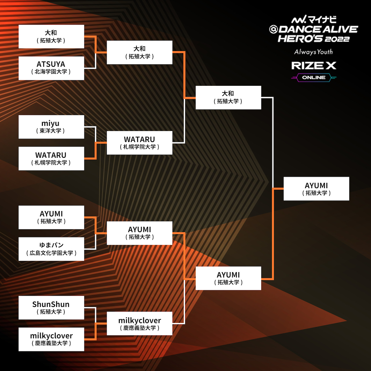 2022年3月12日、国内発信であり世界最大規模のダンスバトルイベント「マイナビDANCE ALIVE HERO’S 2022」のKIDS部門オンライン予選”RIZE X ONLINE”が開催。今シーズンの予選は、オフラインとオンラインで開催。オンライン予選は、Instagramにダンス動画を投稿しWEBサイトにてエントリー、BEST8に進出できる8名をジャッジによる動画審査で選出しBEST8以降はトーナメント方式で行われた。オンライン予選のRIZEは代表戦ソロバトルとなり、最後のFINALIST枠が決定する今回の予選を制したのは、 拓殖大学のAYUMI。FINAL出場権を得たのは、優勝した拓殖大学と札幌学院大学の2校となった。また本日よりBEST8トーナメント映像も公開。
