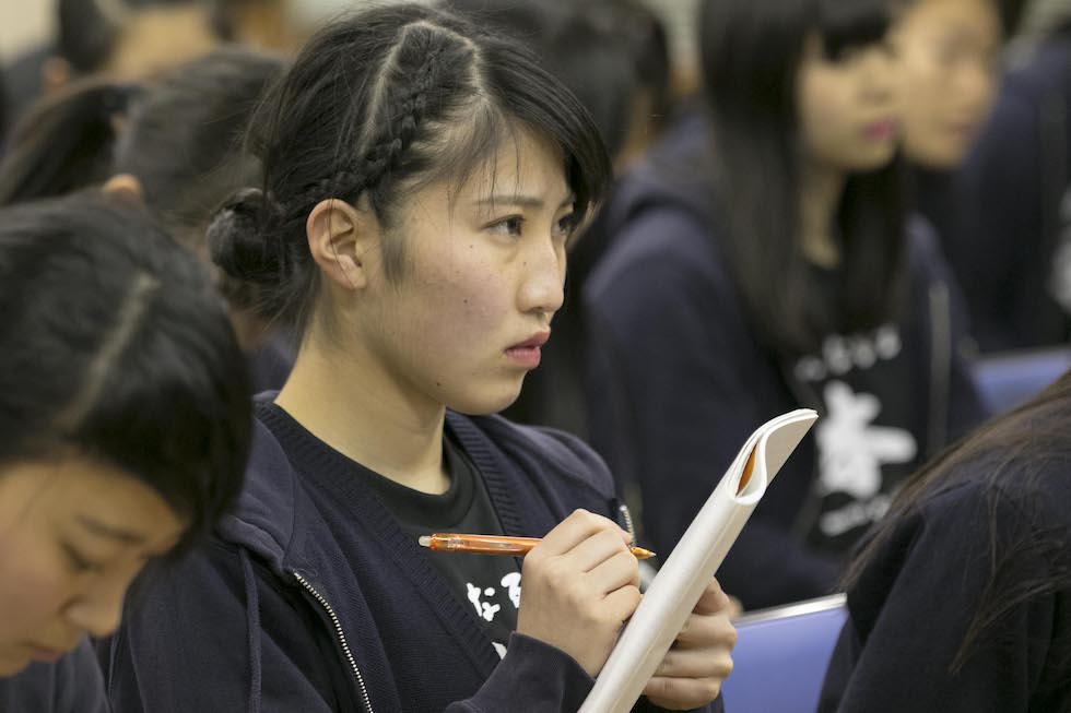 2017年、筆者が大阪府立久米田高校を訪れた際の講習に聞き入る部員。彼女たちの真剣さ・純粋さ・集中力は、ダンス部でこそ培われたものだ。この経験を、きっと次のステージで活かしているに違いない。
