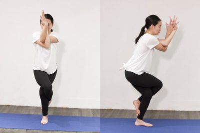 「鷲(ワシ)のポーズ」は、片足立ちで行うポーズです。肩甲骨や背中全体の筋肉をほぐすポーズなので、肩こりや背中の痛みを緩和できます。