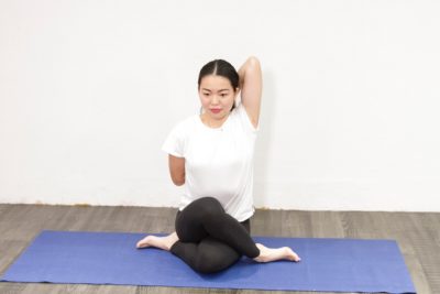 3. 左腕を上げて、肘を曲げたら背中をタッチ。