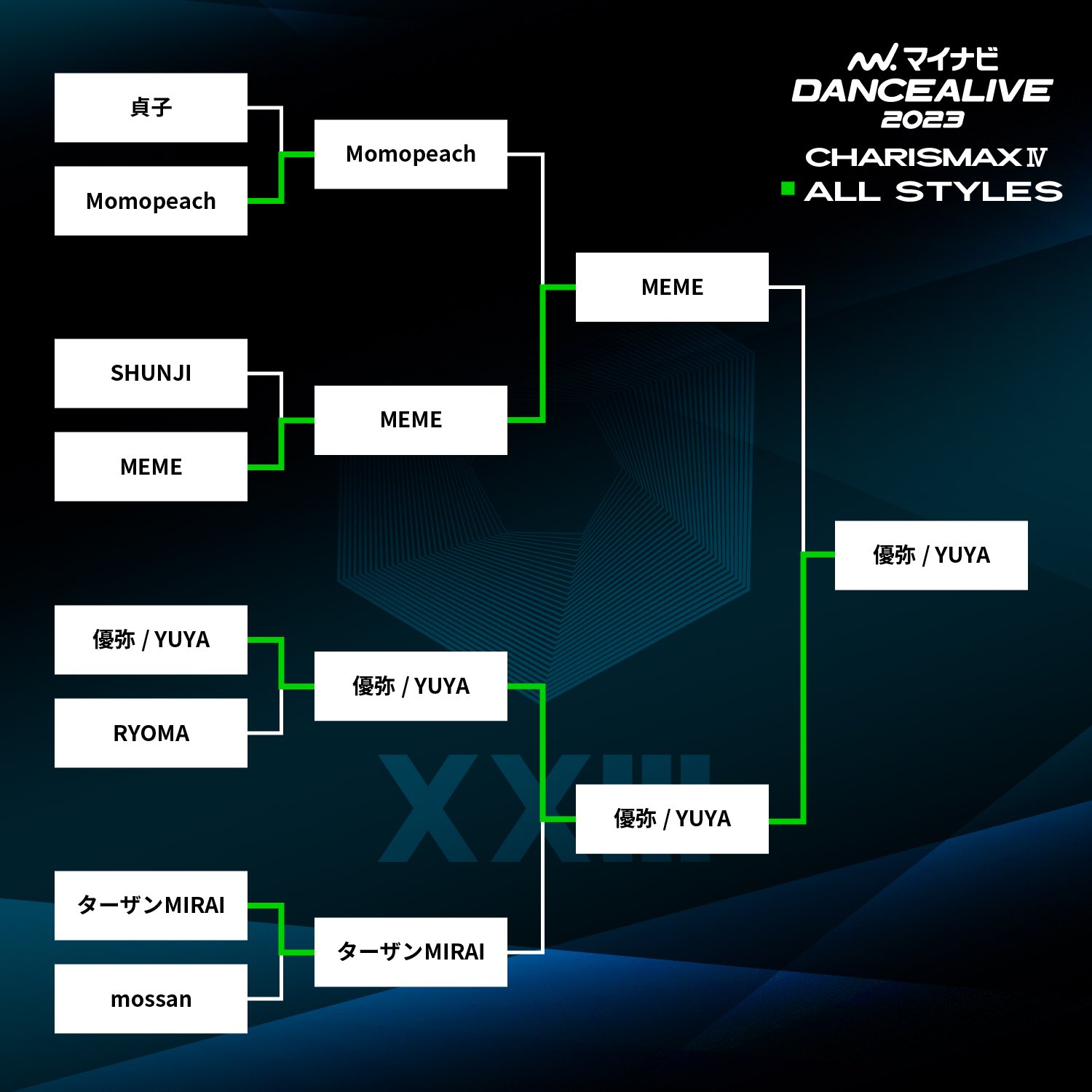 国内発信であり世界最大規模のダンスバトルイベント「マイナビDANCEALIVE 2023」の4STYLES予選が大阪SPACE A-Shにて2023年1月28日&29日の2日間で行われた。CHARISMAX Ⅳを制しFINAL出場を決めたのは下記4名。