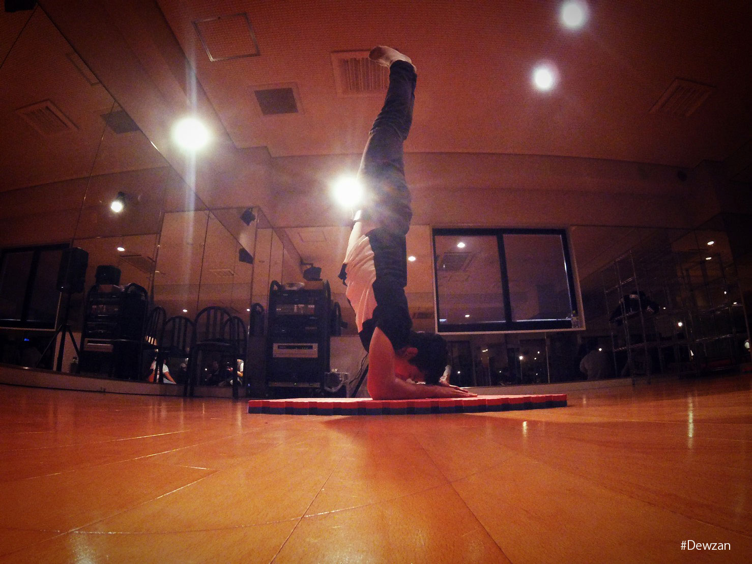 最初は頭も床につけた状態で練習すると早く覚えれます。かなり上腕と肩にくるしバランスをとるために背筋も腹筋もかなり使うのでこの肘倒立は凄くお勧めできます。