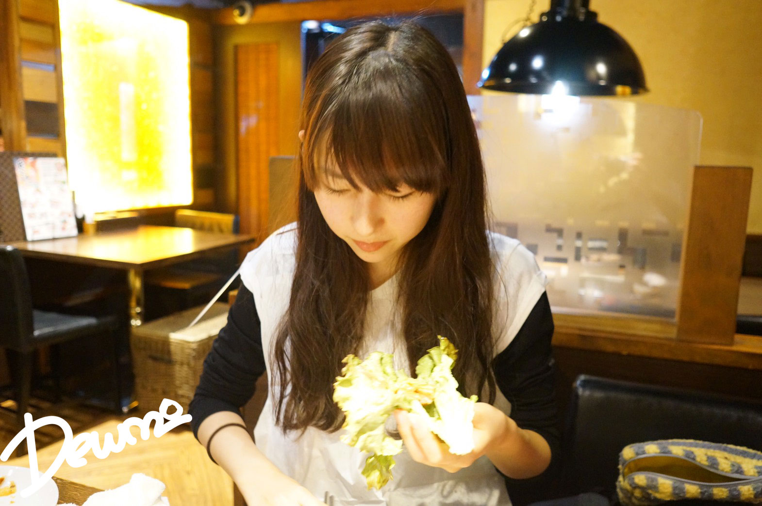 お肉と、もやし、ネギ、キムチとかをサンチュに巻いて食べるから、