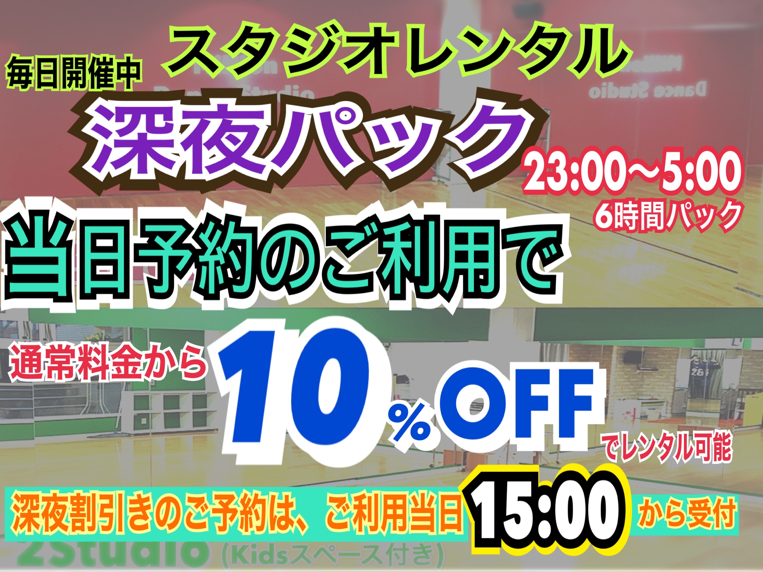 (深夜レンタルの入室時間は、その前のスタジオ使用状況により変わることもございます。)