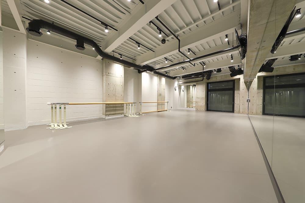 ダンススタジオ全部屋にてリノリウムを床に使用しております。滑りにくく、疲れにくい使用となっておりますので、たくさん動く方にもおすすめです。