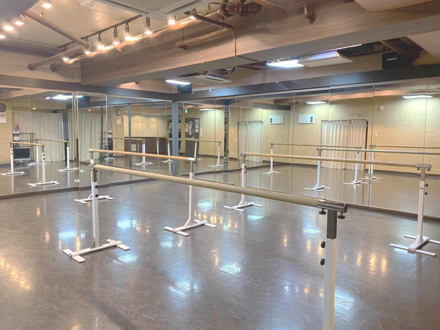 70.4㎡のフロアには、鏡(2面)、音響、レッスンバー、ホワイトボードなど、無料で利用できる備品も数多くご用意しております。