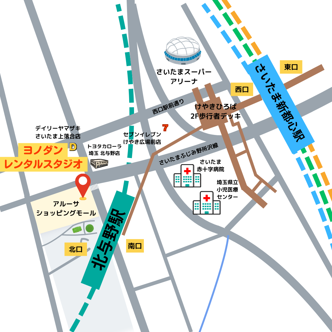 大宮駅のお隣、さいたま新都心駅・北与野駅にあるヨノダンレンタルスタジオ。